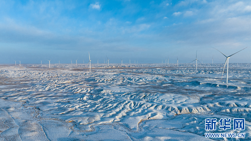 2月4日,一场降雪过后,甘肃省张掖市甘州区平山湖山地草原成排矗立的风力发电机组银装素裹,十分壮观。新华网发(杨潇 摄)