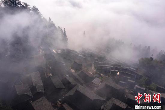 贵州省从江县丙妹镇岜沙苗寨云雾缭绕的山村春景。吴德军 摄