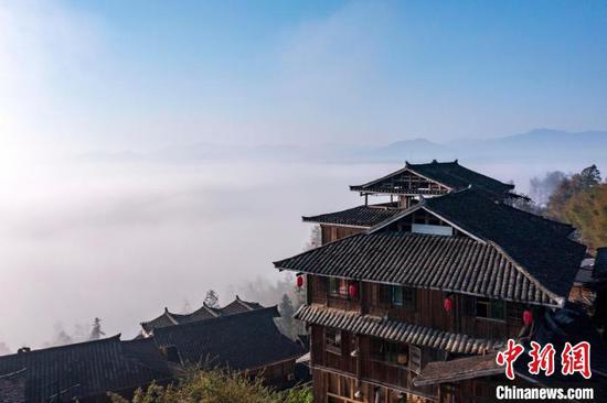 早春时节,贵州省黔东南苗族侗族自治州从江县丙妹镇岜沙苗寨云雾缭绕,山峦锦绣,村庄、田野、民居在云雾中若隐若现,美不胜收。