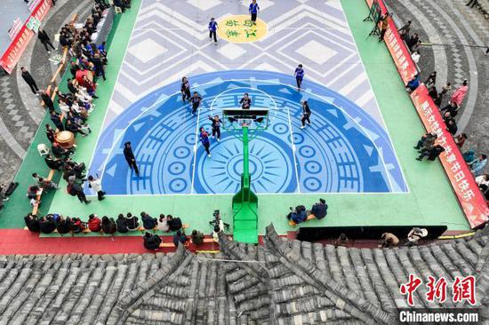 图为姑妈篮球邀请赛赛前的锦鸡舞表演。中新网记者 瞿宏伦 摄