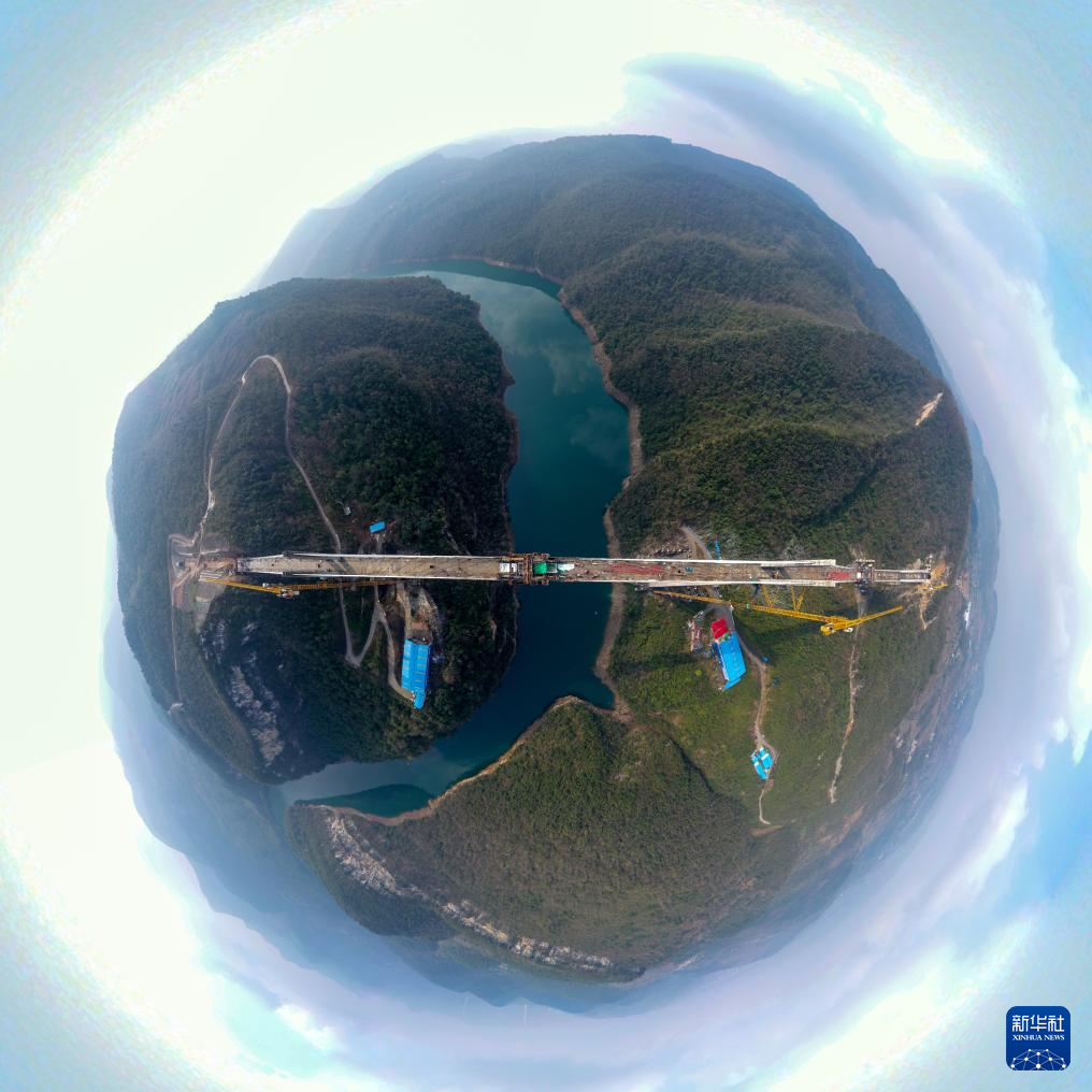 2月6日拍摄的合龙后的瓮马铁路湘江特大桥(无人机全景照片)。新华社发(肖伟摄)