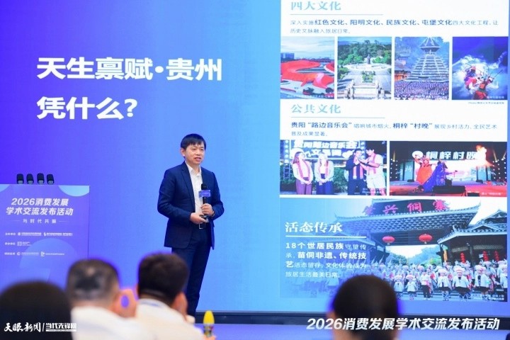 近日,在消博会举办之际,2026消费发展学术交流发布活动在海口举行。会上,贵州旅居行业代表进行了“旅居到贵州,生活更多彩”主题分享,深入阐述贵州旅居产业的广阔前景、发展路径与独特魅力。
